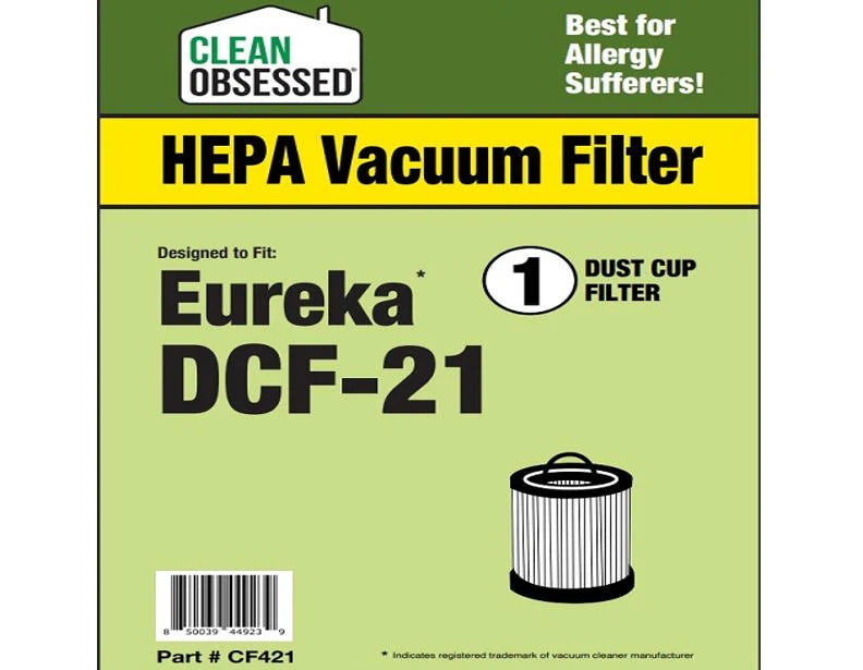 The Clean Obsessed Eureka DCF-21 HEPA Filter, Multiple Bagless Uprights – Part# CF421 by Clean Obsessed fits compatible Eureka bagless upright models requiring DCF-21 filters. Authorized Clean Obsessed Dealer Ace Vacuums can confirm compatibility.