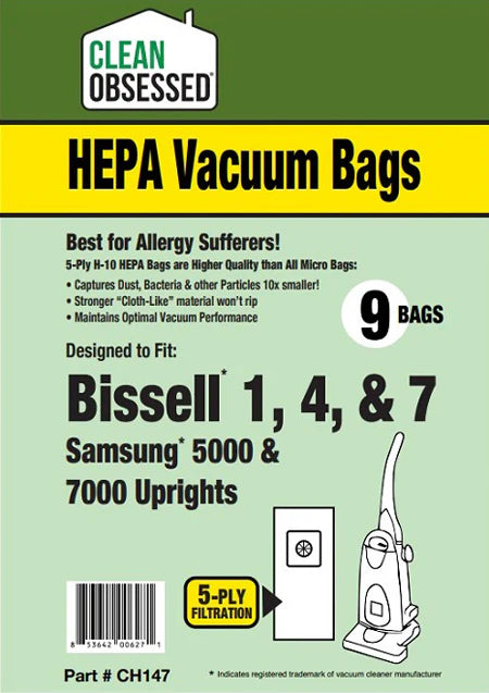 The Clean Obsessed Bissell Type 1 4 7 HEPA Vacuum Bags – 9 Pack Part #CH147 by Clean Obsessed are designed to capture dust, debris, and allergens in compatible vacuums and are available from Authorized Clean Obsessed Dealer Ace Vacuums.