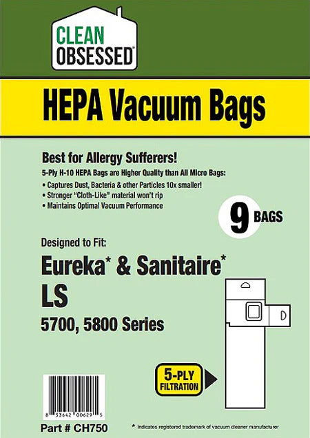 The Clean Obsessed Eureka/Sanitaire Type LS HEPA 9/pk Part# CH750 includes nine HEPA vacuum bags, available from Authorized Clean Obsessed Dealer Ace Vacuums.