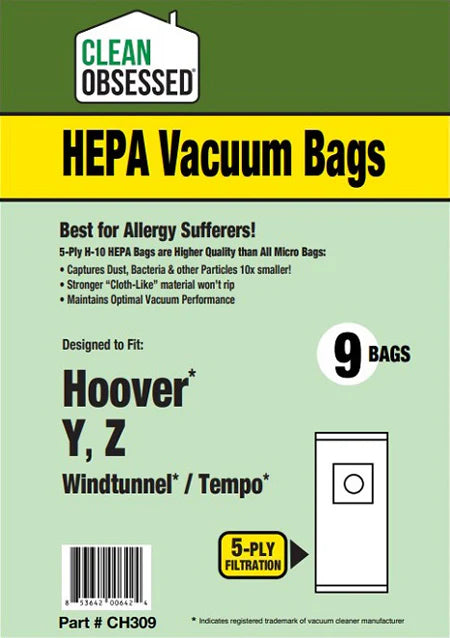 The Clean Obsessed Hoover Type Y HEPA Vacuum Bags - 9 Pack Part# CH309 by Clean Obsessed feature HEPA media filtration to capture fine dust and allergens. Authorized Clean Obsessed Dealer Ace Vacuums guarantees authentic filtration performance.